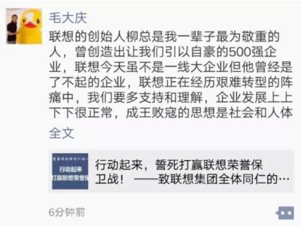 优客工场创始人董事长毛大庆表示,联想的创始人柳总是我一辈子敬重的人,曾创造出让我们引以为自豪的500强企业,联想今天虽不是一线大企业,但他曾经是了不起的企业,联想正在经历艰难转型的阵痛中,我们要多支持和理解。