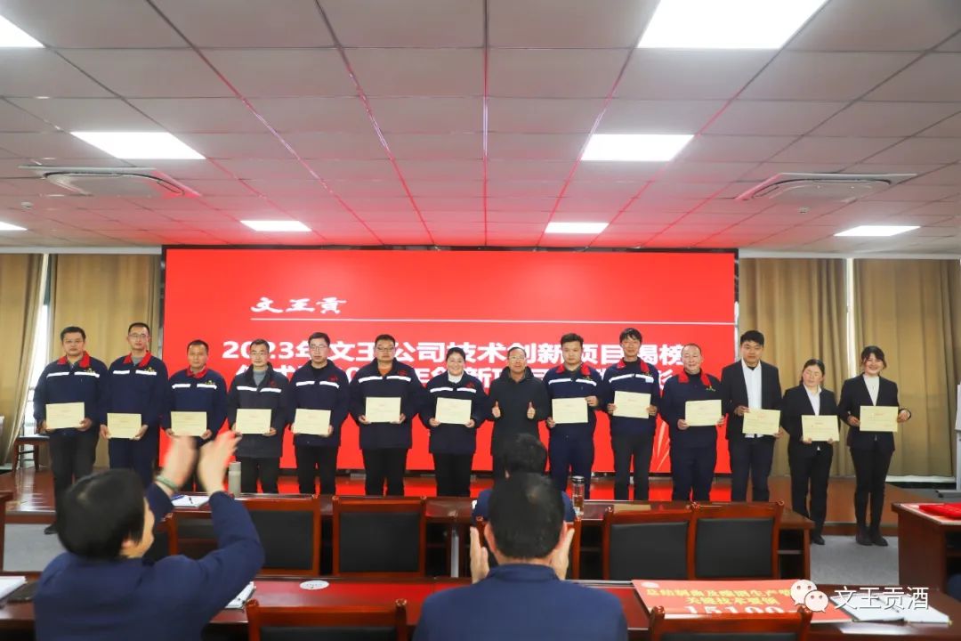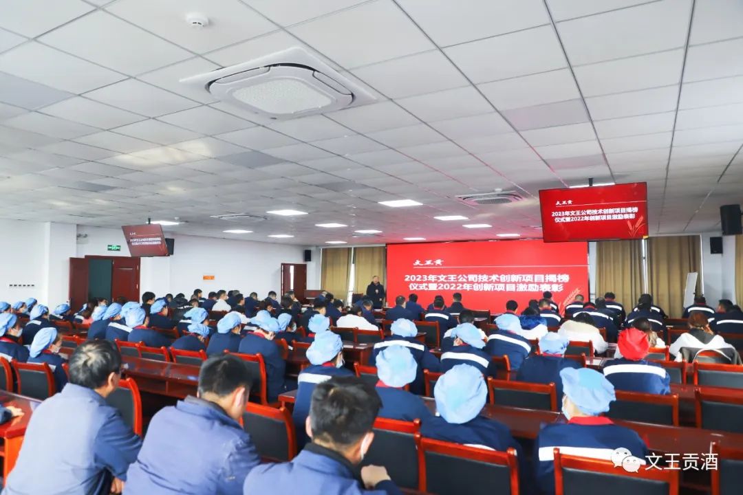 2022年公司各部门成功结题了12项技术创新项目,并取得了一定的质量效益和经济效益,为公司创收直接经济效益约304.26万,2023年共有22项技术创新项目成功立项,其中工艺类11项,酒体研发类2项,检验类3项,设备改造类6项,项目揭榜部门包括技术研发部、生产酿酒部、质量部、生产保障部等部门的技术骨干。会议由技术研发部总监崔磊女士宣读了《关于文王公司技术创新委员会管理办法》、人力资源部主管杜浩同志宣读了《技术进步奖年度激励方案》,并对2022年各获奖团队进行颁奖。